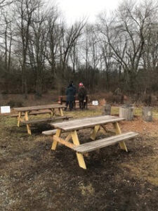 Sam plans to cut holes in the tops so that umbrellas can provide shade in the summer. We will be able to have speakers and activities there as well as welcome visitors to stop and stay awhile. There is a suggestion to add signage that says “pack it in/pack it out” so folks understand that there is no trash can and they must keep the area tidy.