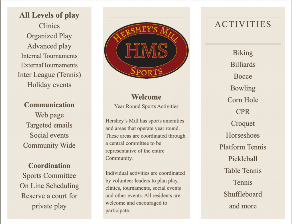 Skedda is the Hershey’s Mill Scheduling Calendar. Sports and other Activities may be viewed on the calendar by any HM resident from the convenience of their home computer, smart phone or tablet by visiting www.hersheysmillhoa.Skedda.com.