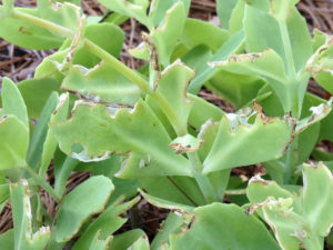 I have been watching a large patch of sedum growing near my deck, and the leaves are looking chewed and wrinkled. I looked closely for insects and didn’t see any.