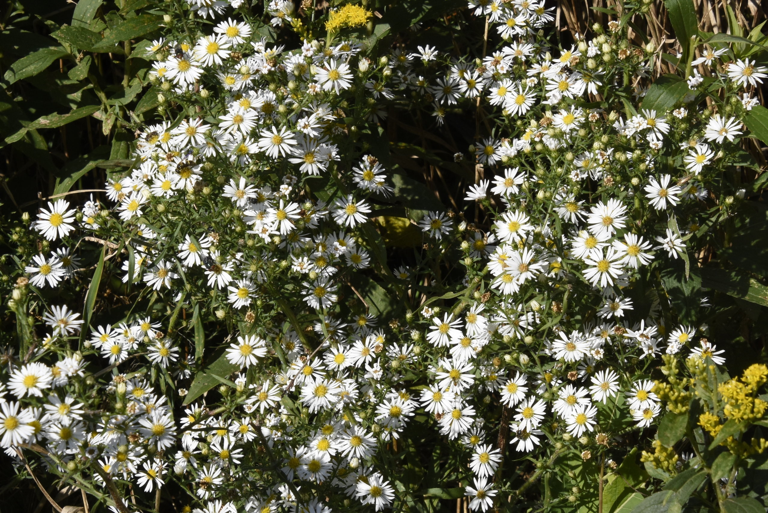 Here at the Mill, we have white and violet or blue varieties. They are about 1 to 2 feet in height, bushy with many small daisy-like flowers. While they are difficult to identify precisely, my Peterson Wildflower Guidebook gives me several possibilities.