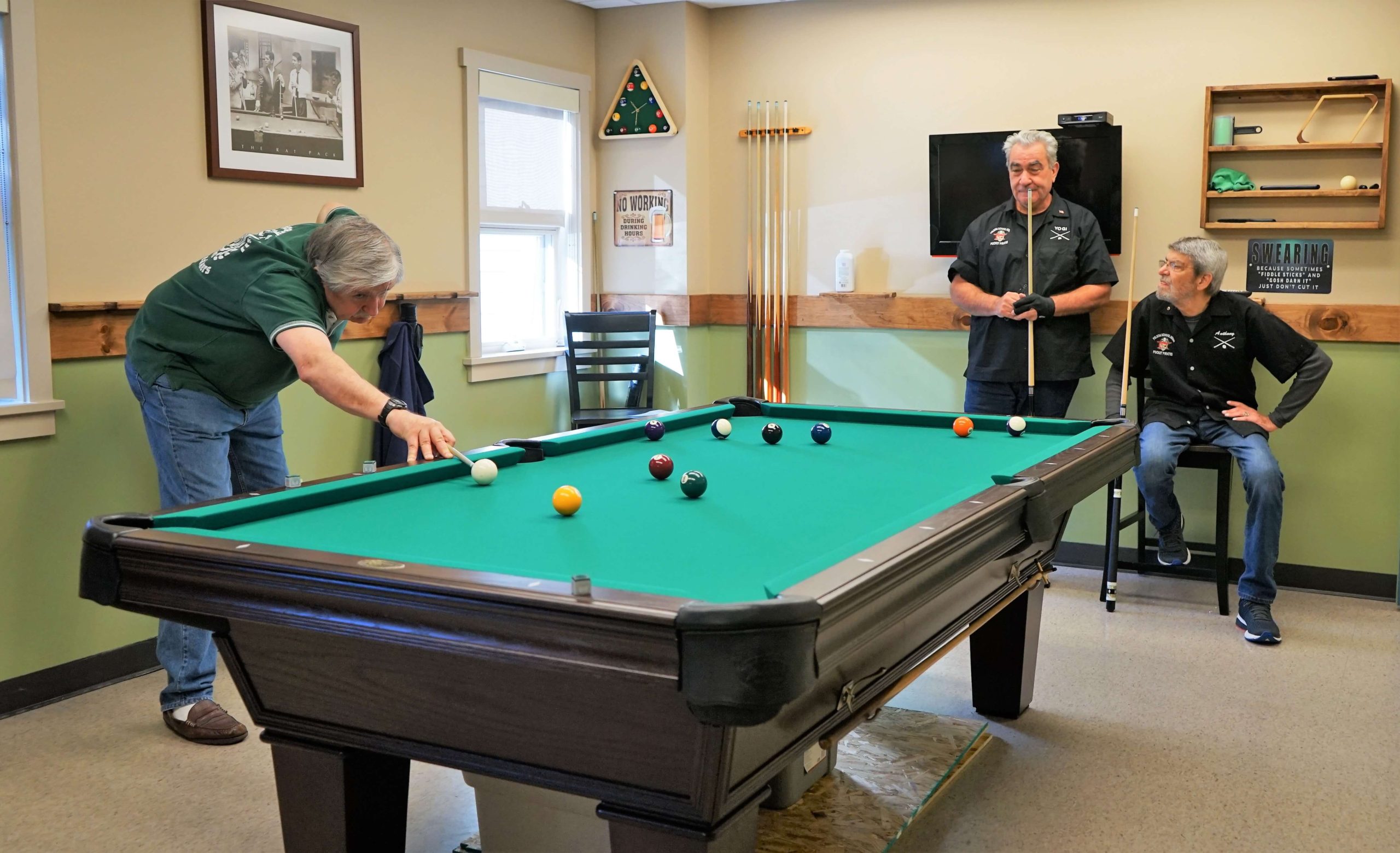 The men’s eight ball team, The Ball Busters, consists of approximately 15 players who regularly play & practice 3 pm to 6 pm Monday through Friday in the Community Center Billiard room.