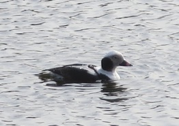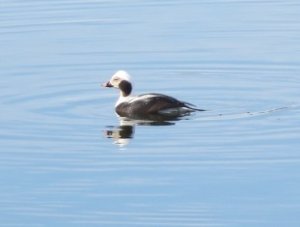 The Long-tailed Duck is a small, slender sea duck with a rounded head and a small bill. The male has long tail plumes most of the year. A very active diver, they spend most of their time underwater and dive down as far as 200 feet. I discovered that we are in the migration path as this bird makes its way north to the tundra for nesting season. My friend and fellow birder,