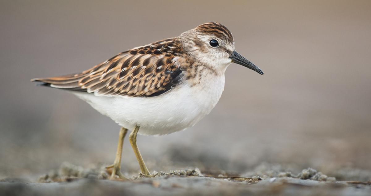 species of sandpipers. As they return to their wintering grounds in South America, they make stops at our inland lakes and ponds. One of the smallest is the Least Sandpiper, only 6 inches in length. However, if you look closely, you will notice yellow legs, although they are sometimes obscured by the mud that gets splattered around!