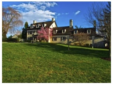 A restored mansion sits on a hill as part of the 800 acres in Hershey’s Mill.
